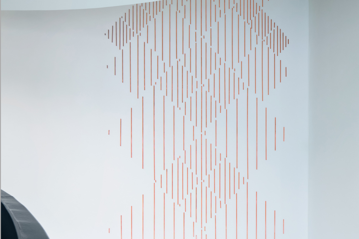 Nel 1996 ha visto la luce Alveare, opera composta da una serie di sottili bacchette in rame, di cui l’artista ha realizzato diverse versioni. Nel caso dello spazio al Museo del Novecento Alveare, 1996 (2024), si dipana lungo una grande parete ponendosi in relazione con la rampa d’ingresso del Museo, disegnata da Italo Rota.